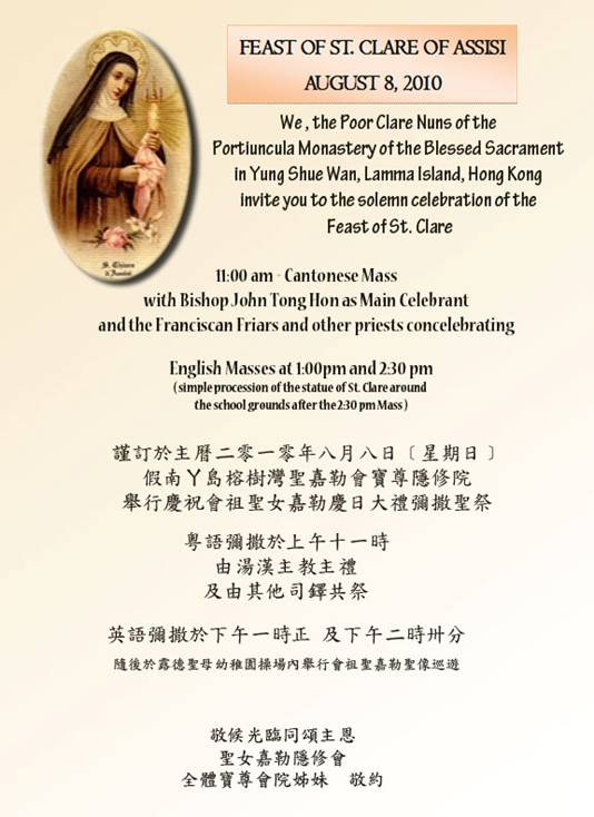 2009南丫島![]() ![]() ![]() ![]() We, the Poor Clare Nuns of the Portiuncula Monastery of the Blessed Sacrament in Yung Shue Wan, Lamma Island, invite you to the Eucharistic Celebration in honor of the Solemnity of our holy foundress, St. Clare of Assisi, on the 9th of August 2009, Sunday 11:00 am - Chinese Mass Cardinal Joesph Zen Ze-Kiun, SDB – Main celebrant 1:00 pm - English Mass Fr. Emil Lim, SVD - Main celebrant 謹訂於主曆二零零九年八月九日(星期日) 假南丫島榕樹灣聖嘉勒會寶尊隱修院 舉行慶祝會祖聖女嘉勒慶日大禮彌撒聖祭。 粵語彌撒於上午十一時 由陳日君樞機主禮【改為李達修院父】 英語彌撒於下午一時正 由聖言會林永基神父主禮 敬候光臨同頌主恩 聖女嘉勒隱修會 全體寶尊會院姊妹 敬約 |