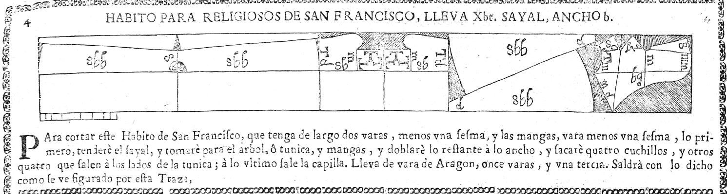 Up through the 18th century most tailoring did not utilize patterns as we understand them today but rather utilized geometric principles chalked directly on the cloth. Beginning in the 16thC, to facilitate this process as well as to teach how to lay out garment pieces for efficient utilization of fabrics, cutting diagrams were produced. Shown below are the cutting diagrams for friars habits that we have identified so far, taken from Spanish tailoring manuals from 1618, 1640, and 1720. All of these patterns are for rounded hoods with combined cowls as utilized by Observant Franciscans during the period. When transcribing them for use, adaptation to a pointed hood (Recollect friars, Capuchins, etc.) is accomplished by simply extending the top line of the hood and curving the line underneath gradually into the back of the neck. Fuller directions on measuring, drafting, and construction will be coming in future posts. In the meantime, enjoy these cutting diagrams. ![]() ![]() ![]() ![]() |
