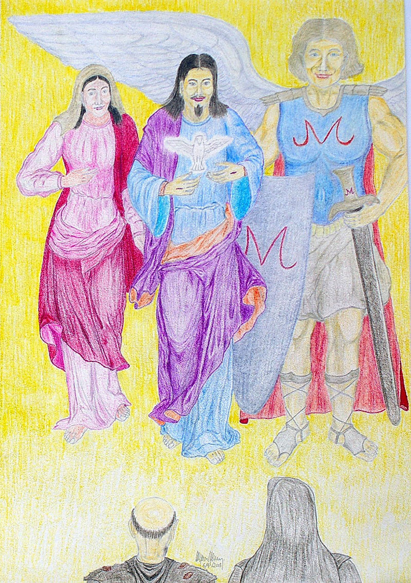 | 左方的聖母,與身旁的愛子、我們的主和導師耶穌基督衣袂輕揚,在聖彌額爾總領天使陪伴下,一起走向方濟和佳蘭,聆聽他們的祈禱。耶穌胸前的鴿子代表聖母的淨配天主聖神,身後的黃光代表至高至尊君王、聖母父親兼主人的天主聖父。16/4/2008 |