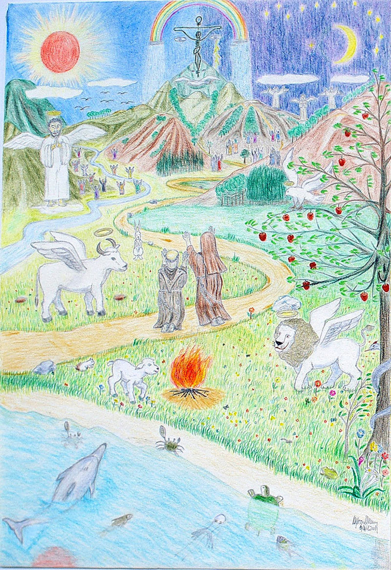 聖方濟的苦難日課是以其天主經釋義作為開始的,之後是聖三光榮經,然後就是唸這首時辰讚歌。 時辰讚歌相信是聖方濟參照默示錄、達尼爾先知書的三聖童頌和聖詠六九(68)35寫成,他效默示錄的四活物、二十四長老(以色列十二支派、耶穌的十二宗徒)和眾天使,邀請上主的一切化工(日、月、風、水、火、土),特別是天上、地上、地下和海中的萬物,與他一起好像三聖童那樣讚美天主。 時辰讚歌圖上端中央是一個豎立在山上、代表天主聖子耶穌基督的十字架(也是天主聖父的鼻和眉毛);十字架之下是代表天主聖神的鴿子(也是天主聖父的鬍子和上唇);十字架上的彩虹(也是天主聖父的頭髮)代表天主與諾厄所訂的盟約:天主從兩片烏雲降下的雨(也是天主的鬢髮)只會滋潤大地,而不會毀滅大地上的生物;天主的眼(就是十字架左右兩旁的兩片污雲)垂視大地,衪的目光有如閃電;山嶽是衪的臉孔(鴿子與十字架間的山頭構成了天主聖父的鼻子和人中、鴿子下的山構成了天主聖父的下唇和下巴)、樹木是衪的美髯。 圖中央跪著讚頌天主聖三的是方濟與佳蘭,他們四周有四活物在陪伴;遠方河兩岸散佈著的以色列十二支派,以及遠方山上一對對往各方傳教的十二宗徒,也正隨同著他們上方的三位天使一起讚頌天主。 日月同時照耀著大地,星星佈滿天空,微風輕吹,河水從遠山奔流入海,柴火為人帶來暖意,大地上花草樹木欣欣向榮。 遠方天上的飛鳥、地上的羔羊與兔子、地下的鼠和蚯蚓、水中的青蛙、螃蟹、龜、魚也都在讚美天主。 蛇則在果樹上監視著,伺機而動。 16/4/2008 |