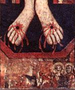 ![]() 在耶穌腳下,清楚看到兩個頭戴光環的聖人,但無法確定他們的身份。按傳統說法,這裏本應有六位聖人,他們都是翁布里亞省的主保聖人,分別為:聖達勉,聖天使彌額爾,聖路斐諾( Rufino ),聖若翰洗者,聖伯多祿和聖保祿。 除了底部外,聖像畫的周邊都圍上了貝殼。而耶穌腳部有一黑色的空間,他展伸的雙手的背後也有黑色的空間。十字架聖像畫的最底部,即六位聖人的下面,有一個泥土顏色的基礎,好像在承托起整個十字架。貝殼的圍邊到此為止,好像是一道打開的門,門口站立著翁布里亞的主保,歡迎人由此路進。 |