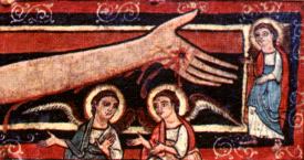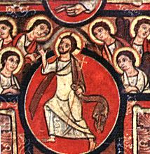 ![]() ![]() 罪狀牌的上端,似乎是另一個境界,像是天國的氛圍。在那裏,有一個圓環,內有復活的基督。有十位天使,還有天父的右手。圓環中心的人物,是拾步而登的基督。這位基督身穿金袍,肩掛紫紅色披肩,左手持著紅、金二色的十字架。他的頭部及右手突破圓環,冠冕有十字記號的金環,臉面及雙目注視高處。耶穌頭上戴的不再是茨冠,而是有十字記號的金環。只有半個圓環的下半,意味著人不能見到其上半。在圓環內的是一隻右手,那是天主父的手。右手的兩隻指頭,是一個降福的姿勢。復活基督的左右,共有十位天使,而十的數字象徵的是全部和圓滿。他們臉上都表現出歡愉之情,似在慶賀基督的復活,歡迎他重回天父的懷抱。另外,在耶穌手掌的兩旁及下方,共有六位天使,好像在觀望及討論耶穌的苦難及湧流的鮮血。 |