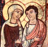 ![]() 雅各伯的瑪利亞,是對觀福音所提及的次雅各伯和若瑟的母親,若望福音所說的克羅帕的妻子。在聖像畫中,這位瑪利亞好像正和她的同伴瑪利亞瑪達肋納密談,討論耶穌的事蹟。她的手指向耶穌,像似在安慰她的同伴。瑪達肋納的瑪利亞和耶穌母親的姿勢相近,把左手放置在面頰上,表露了極度的悲痛。她雖站在耶穌身旁,卻把頭背著耶穌,流露了傷痛之情,好像不忍目睹,因為她愛的多。若望站在耶穌身軀的右邊,他的姿態類似瑪利亞瑪達肋納,緊貼著耶穌。耶穌肋旁湧溢的血,好像要激射到若望的頭上。若望應是福音所說的耶穌所愛的門徒;即在晚餐廳中,緊靠在耶穌胸膛上,欲知耶穌心意的那一位。耶穌的母親瑪利亞和瑪利亞瑪達肋納的姿勢相近,都是把左手放置在面頰上,表露了極度的悲痛。和瑪達肋納不同的,是她面向耶穌,雙目加以凝視。她的右手和若望一樣,指向耶穌,似乎二人在討論有關耶穌的一切。瑪利亞站在耶穌的最右邊,這是顯要、尊貴的位置。 |