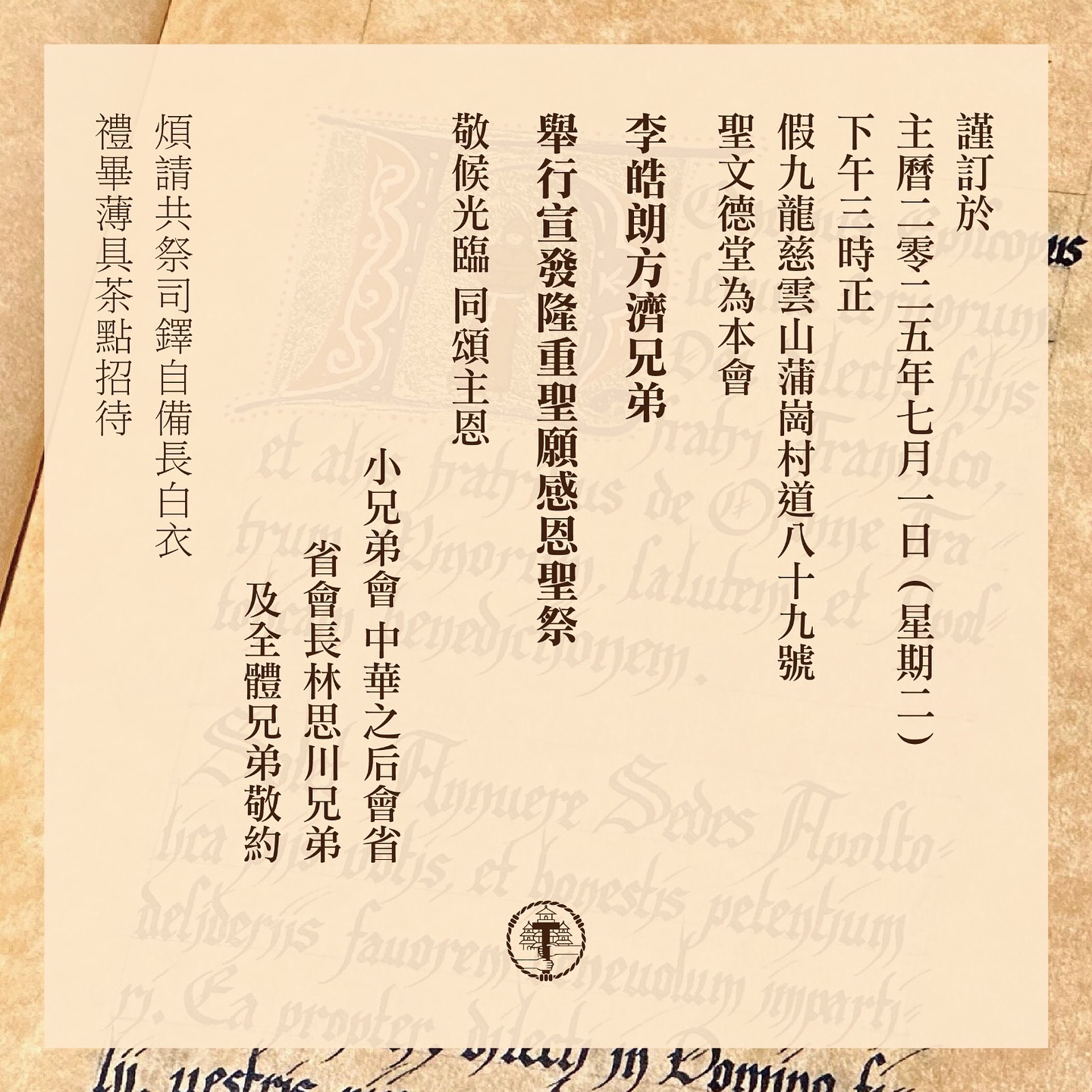小兄弟會謹定於 2025年 12月12日星期五晚上8時,在慈雲山聖文德堂為盧神父兄弟舉行守靈祈禱。並於翌日12月13日星期六早上 9時30分,在同一地點舉行逾越聖祭,隨即下葬於跑馬地聖彌額爾墳場。